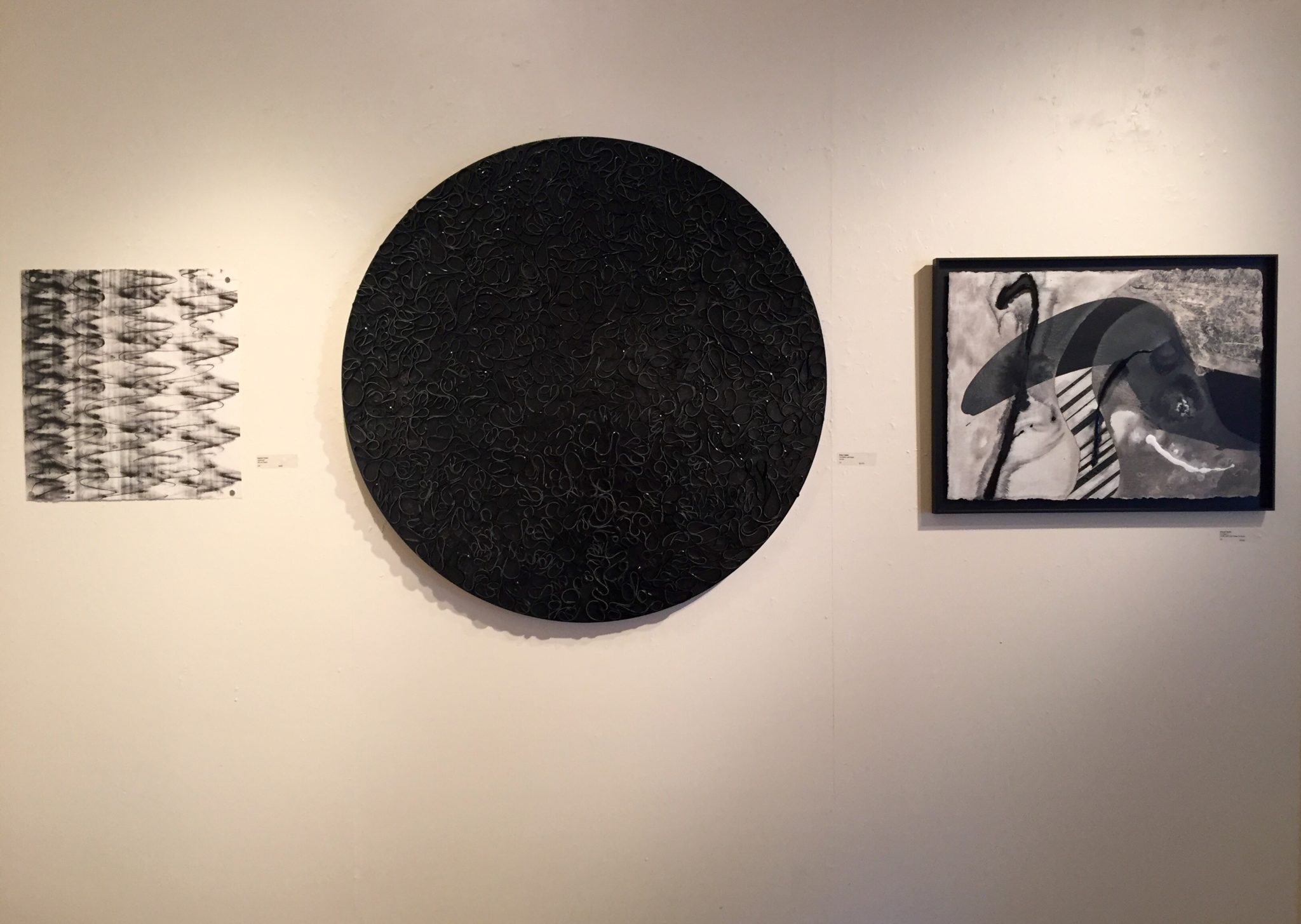 Rinkovsky selected work based on these measures to present widespread artistic interpretations of black and white in all media, and with the installation in mind. In her juror statement, she reflects how the exhibition demonstrates unique tactility and value range, contrasting negative/positive shapes, lines and textures throughout each composition, and patterns with movement “akin to a wall-sized musical score”. Rinkovsky also acknowledges the interesting use of poetic text and metaphorical language that stands out in various pieces.